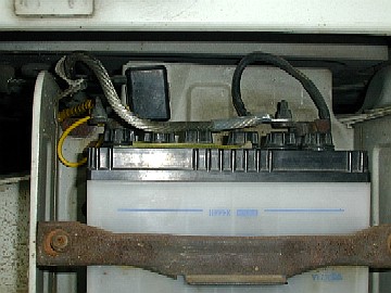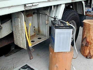 プラス側の配線を外し、新しいケーブルと交換しました。黄色い細い線の圧着端子は、工具が無いのでハンマーでつぶしました。バッテリーを引っ張り出して、本来の目的のアーシング線をマイナス側に接続します。 |