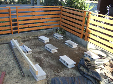 駐車場が使えるように薪棚を作成!まずはブロックで基礎作り。意外と8箇所のレベルを合わせるのに時間がかかった。 |