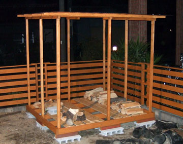 3週目、柱の増設と、床の処理8本の柱では、薪を積んでも転がっていってしまうじゃないですか!まぁ、積み方次第なんでしょうけどね。 と言うわけで、転び留めの柱を増設することにしました。それに伴い床の貼り方を変更。 土曜日の1日でできると思っていたのですが、雪が降りお昼の雪の少ない2時間程度作業をしただけで終了。 翌日午前中で、完成!! ・・・・・・・・・・・と、思っていたら、転び留めの柱側に補強を入れるのを忘れてました。(片付けている時に気がつきました) |