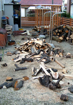 煙突工事をやらなければならないのだが、薪の確保も大切。と、言うことで作業の時間の合間を見て、薪割り!しかし手斧しかないので、はかどらず。でも薪は少しずつ増えてゆくので車が駐車場に止めれない状態。庭に青空駐車。 |