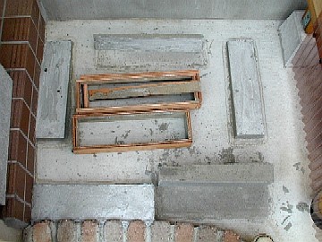 枠に書いておいた線引きしたところまでコンクリートを流しある程度水平にします。3日乾燥させた後、枠を取るとびっくり!! 写真の上と右下のコンクリートまでいっしょに取れてしまいました。(泣) |