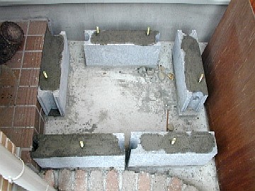 取れたコンクリートをやはりセメントで固定し、その上に薄くセメントを塗り、その上にブロックを乗せます。穴の中にも2〜3cmほどコンクリートを流し、土台とブロックを固定しました。 さらに1日乾かして、穴の中に庭から拾ってきた小石を埋め、穴をセメントでふさぎました。 この基礎と土台と固定するため、アンカーの変わりにボルトを埋めました。 |