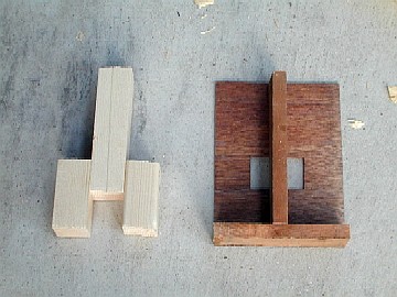 さて、いよいよログの加工です。今回利用するログは、安く手に入る2×4のSPF材です。なんとホームセンターオープン価格で、6フィート(182cm)200円以下で手に入れられました。 ログを加工する前に、道具を2つ作りました。写真の左は通しボルトをドライバーで開ける時に、垂直を確認する物です。右はノッチを切る場所を線引きする定規です。これを作ると、いちいち寸法を測らなくていいので、作業がかなり早くなります。 |
