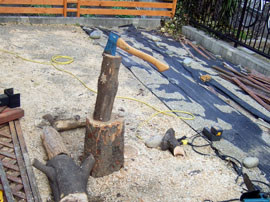 煙突工事をやらなければならないのだが、薪の確保も大切。と、言うことで作業の時間の合間を見て、薪割り!しかし手斧しかないので、はかどらず。でも薪は少しずつ増えてゆくので車が駐車場に止めれない状態。庭に青空駐車。 |