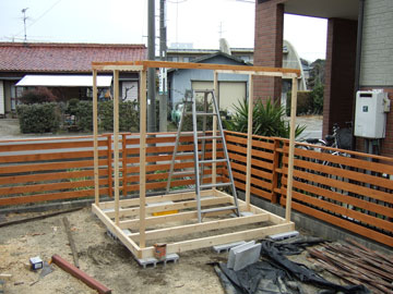 土台を組んで、柱を立てて、とりあえずパーゴラ状態。1日目は、半日しか作業できなかったのでここで終了。 |