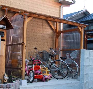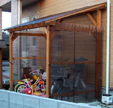 雑誌を参考に作りました。ちょっとケチって、柱は90mm→75mm角に、垂木は2×4→2×4の半割(2×2?)、頬杖は2×4を使用。波板は、ポリカーボネイトのブロンズです。基礎の束石は、工務店さんにコンクリートを張ってもらうときにいっしょに埋めてもらいました。 |