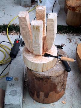 え〜っと、どうやって作るんだっけなぁ(^^;と思いながら、刻み始めちゃいました。自然暮らしの会の栗田師匠が作っているのを1度見たことがあるんだけど、作るのは初めて。うまく出来るかな?すでに足のバランスが悪そう。悪戦苦闘中! |