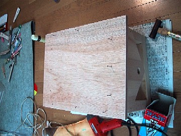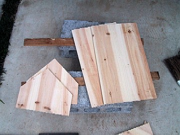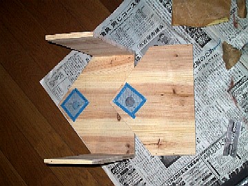 今回はちょっと小物に挑戦。材料は、¥100ショップで手に入れた杉の集成材(250mm×450mm×9mm)を3枚と、コンパネ端材¥50、蝶番¥120、網戸の張替えで残った網です。 まずは、集成材と、ベースになるコンパネをカット。 |