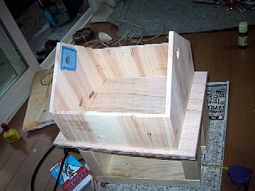 妻壁の位置にドリルで穴を開けて、内側から網戸の網をタッカーで固定します。終わったら組み立て開始。まずは壁を組み立てます。 木工ボンドと、ありあわせの真鍮クギで固定します。 |