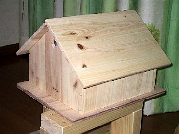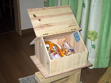 手前の屋根を開けたところです。奥の屋根に蝶番で固定してあります。塗装は妻に任せると言ったら、『塗らない』との返事だったので、このまま利用しています。 どこがログハウス風だ!!・・・なんて言わないでね。雰囲気ですから(汗 使い始めて2ヶ月ほどたちますが、子供の友達が遊びに来て、『何これ〜、変なおうち!』とすこぶる評判が悪いそうです(泣) でも、パンが腐らなくなったと言います。今まではワゴンの上に放置してあったので、賞味期限が来るころにカビが生えたり、乾燥してしまったりしたそうですが、ブレッドケースに入れるようになってからは、賞味期限を5日ほど越えても大丈夫です。(ぉぃ) |