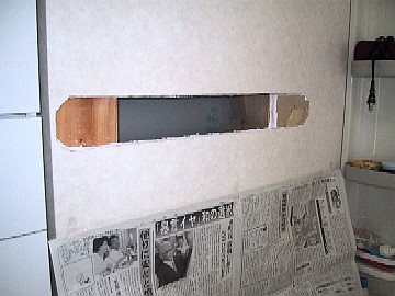 次に、ハンガーを取り付けるところの石膏ボードに、端材で作ったベースの大きさで穴をあけます。ついに新築の家に大きな穴をあけてしまいました。主にカッターでの作業ですが、石膏ボードはすごい埃が出ます。 端材のベースより、気持ち小さく穴を開けたのですが、なかなか入る穴にならず苦労しました。 写真は途中ですが、手前は普通の柱で、奥の方には石膏ボード固定用の細い柱が有ります。ここには断熱材が入っていないですね。 |