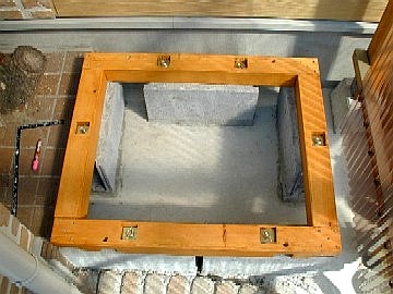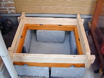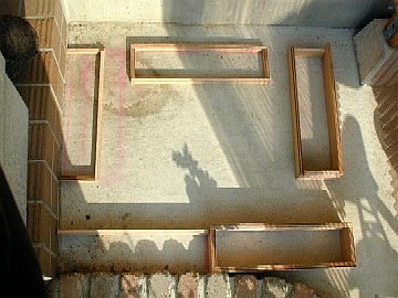作った枠を配置してみました。この枠には、あらかじめ測量した結果、コンクリートをどこまで入れるかを鉛筆で線引きしておきます。 |