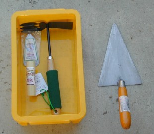 さてセメントの作成です。今回はインスタントセメントを使いました。とても役に立ったのが、写真左に写っている、100円ショップで買ってきた、黄色のコンテナケース、セメントをならすコテ、園芸用のクワです。これでセメントを1〜2Kg程度ずつ作るのは十分でした。 |